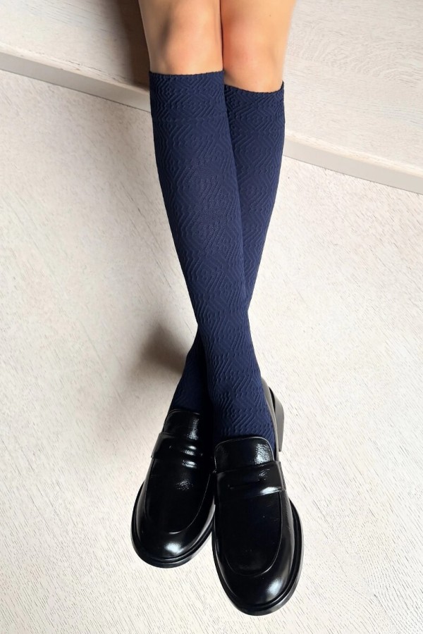 Sosete inalte de dama realizate din microfibra de inalta calitate, cu model geometric usor iesit in relief.