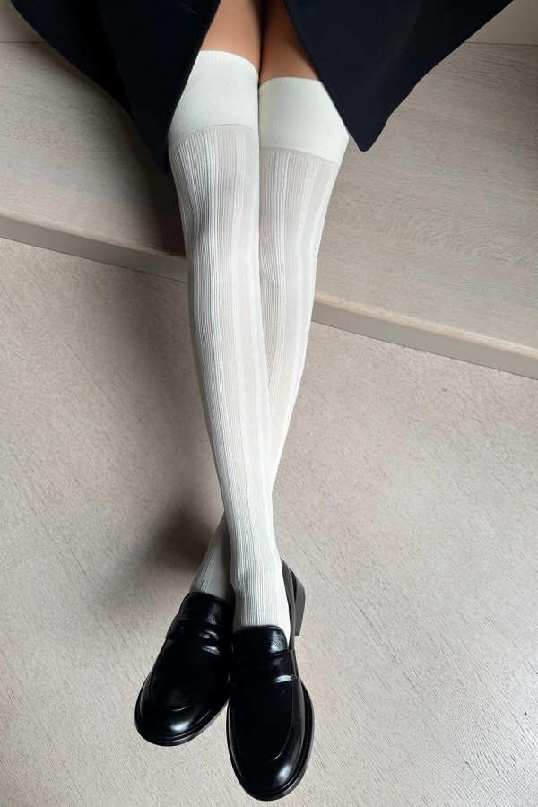 Ciorapi 2/3 de dama realizati din microfibra de inalta calitate. Ciorapii prezinta model deosebit cu dungi late, usor iesite in relief si sunt finisati in partea superioara cu o banda elastica lata, care nu exercita presiune asupra piciorului.