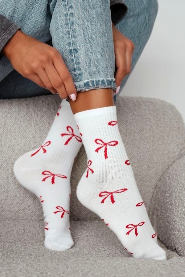 Sosete de dama realizate din bumbac de inalta calitate si adaos de fibre elastice, cu model deosebit cu fundite.