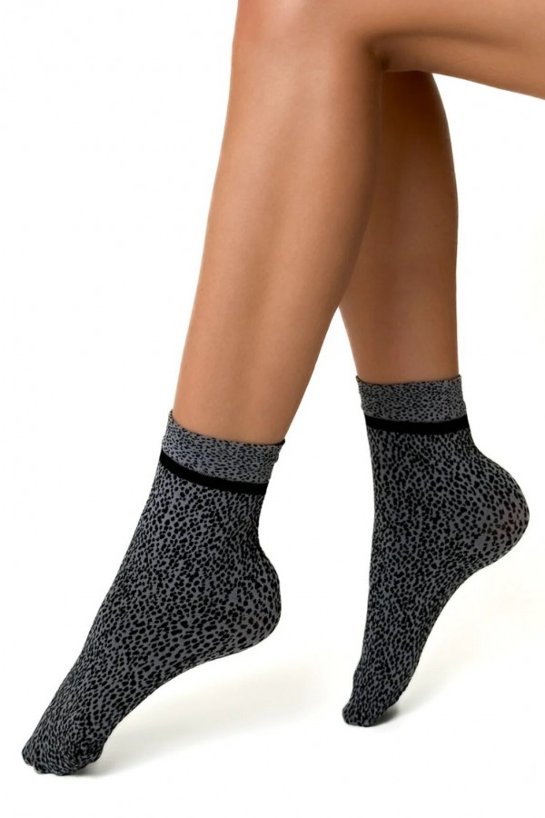 Sosete de dama realizate din microfibra de inalta calitate. Sosetele prezinta model animal print si sunt infrumusetate in partea superioara cu banda neagra decorativa.